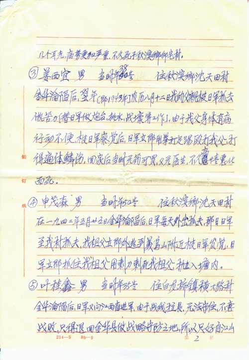金华沦陷后,日军驻扎我村时,我家中大小都逃至蚌龙村躲避日军抓夫和殴打等,家中只留我父一人看守家具和粮食,不料那日日军竟走到我家中,我父躲藏在牛棚角落黑暗之处,被日军发现,日军叫我父走出外面,日军就用木棍打我的父亲,我父当场被日军打得口吐鲜血,身负重伤,过三、四天就死亡。
