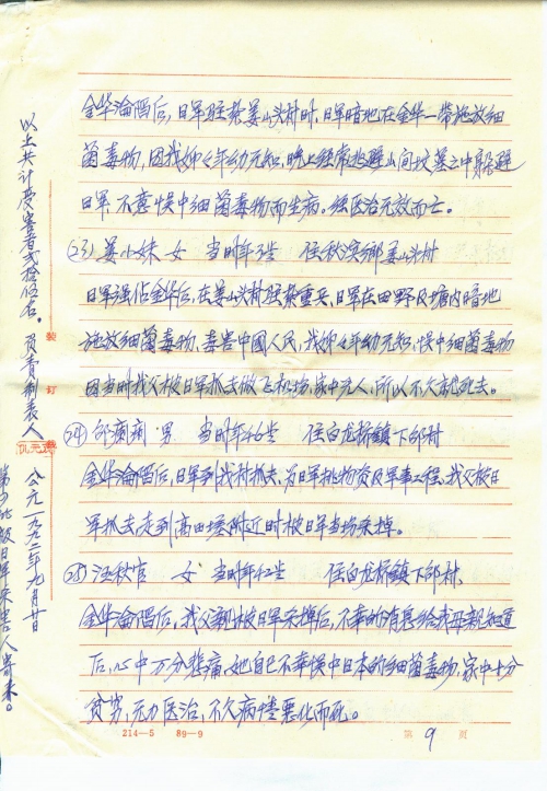 日军强占金华后,在姜山头村驻扎重兵,日军在田野及塘内暗地施放细菌毒物,毒害中国人民,我姐姐年幼无知,误中细菌毒物,因当时我父被日军抓去做飞机场,家中无人,所以不久就死去。