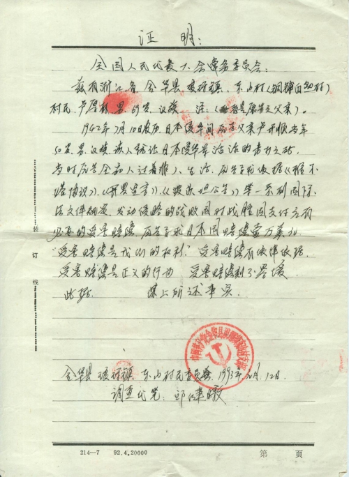 细节:卢厚林的父亲卢开顺在1942年7月10日被日军活活打死,要求日本赔偿。信中有村支部盖章证明。