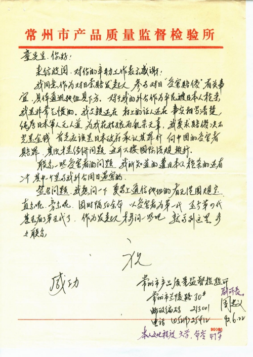 我同意作为对日索赔发起人,参与对日“受害赔偿”有关事宜,具体通讯地址见下方,对于我的外公作为平民被日本人枪杀,我是非常气愤的,我父亲还在,村上的证人还在,事实相当清楚,纯属日本军人无人道,为找花姑娘而乱杀无辜,我要求赔偿绝不光是金钱,首先应该是日本政府承认其罪行,向中国的受害者赔罪,其次才是经济问题,这可以按国际法规执行。