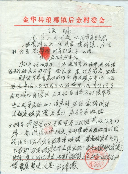 细节:金翠香的父亲金长实在1942年4月被日军活活打死,要求日本赔偿。信中有村委盖章证明。