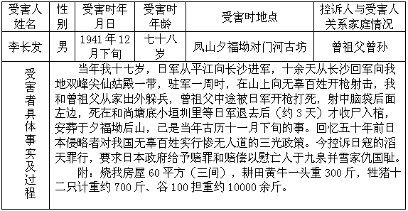 我二十三岁那年,日军侵华由平江向长沙进军由我地经过十天后,由长沙回军我地驻扎双华尖仙殿一带,驻军时在山上向无辜百姓开枪,下山时烧房屋杀牛、杀猪、挑稻谷等等情况我地李长发从家外躲兵由和尚塘经过被日军看见开枪击中李长发后脑左边不幸死情况属实,特此证明。