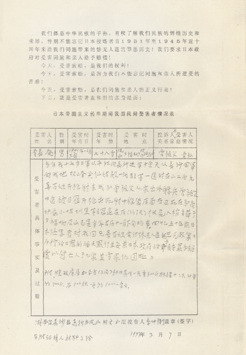细节:1941年12月我和曾祖父一起外出躲避日本兵的中途被发现,日寇开枪射击后曾祖父死亡,日寇还烧毁了我家的房屋因此日本政府必须赔偿我家所有的损失以慰亡灵。备注:信封丢失