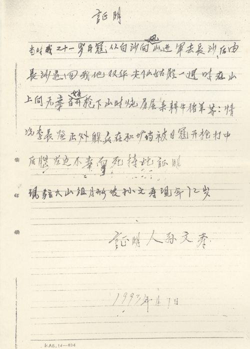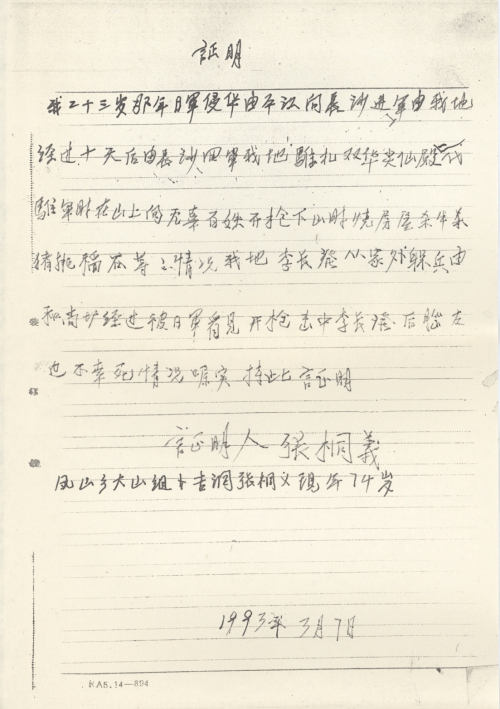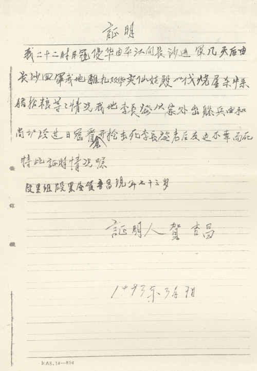 当时我二十一岁,日寇从白沙向凤山进军去长沙,后由长沙退回我地双华老仙姑殿一周时,在山上向无辜百姓开枪,下山时烧房屋杀耕牛、猪、羊等等情况。李长发出外躲兵在和尚塘被日寇开枪打中后脑左边不幸而死,特此证明。
