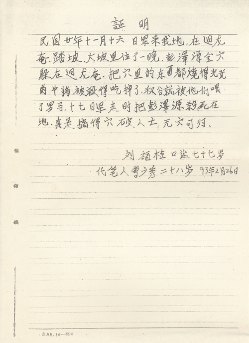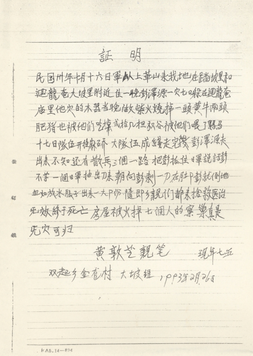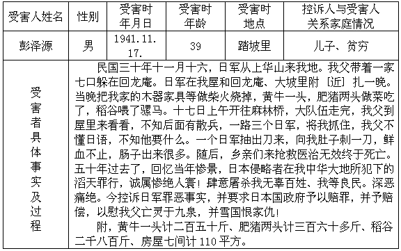 民国三十年十月十六日军从上革山来我地在踏坡里和回龙庵大坡里附近住一晚,彭泽源一家七口躲在回龙庵庙里,他家的木器当晚做柴火烧掉,一头黄牛两头肥猪也被他们吃掉,二十几担稻谷被他们喂了骡马。十七日队伍开往麻桥大队伍成线走完后彭泽源走出来不知还有散兵三个一路把彭抓住,日军说话彭不懂,一个日军抽出刀来朝向彭刺一刀在肚部,彭就倒地血如放水肠子出来一大部分,随即乡亲们都来抢救医治无效终于死亡。房屋被火掉七个人的穴巢,真是无家可归。