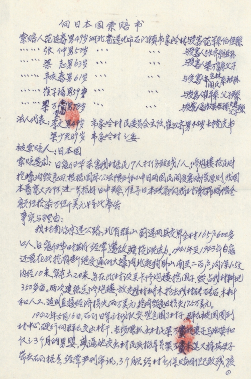 索赔要求:日寇侵华杀害我村居民7人打伤致残1人,修炮楼抢民财挖壕沟毁良田,根据国际公法惯例和中日两国民间受害赔偿原则,我国本着宽大为怀,进一步搞好日中关系,准予日本政府向我村谢罪赔偿金额五十七万五千美元特此奉告。