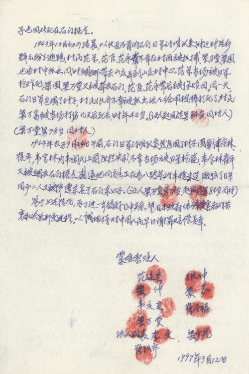 1943年10月初四清晨,以长召为首的石门日军讨伐队来附近村清乡群众纷纷逃跑,村民范军、范臣、范永常不幸在村西被抓捕,梁万堂、梁囤也由村中抓出,同时捆绑带去山庄,范臣、范永常后被保赎回。同一天,石门日军包围了村子,村民张齐不幸被抓出活活给用棍棒打死了。村民梁万富被当场打伤,几天后死去,时年42岁。(证人赵凤连男84岁,同村人)(梁万堂男78岁同村人)