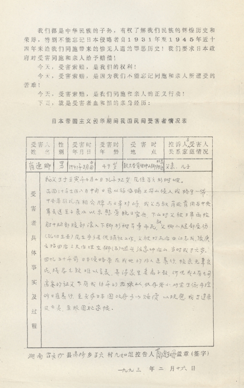 回顾民国三十年八月日寇犯湘,生灵涂炭,人民苦于水深火热之中,杀我无辜百姓肖连卿,肖为慰劳我抗日战士国民军某部。肩挑豆子茶水,何期军情有变,抗日军转移。肖误入敌网,不辨敌我,被日寇枪杀,两处受至死重伤,胸前肚部致死,死于现高桥乡百录村大岭背组佃冲里屋下首山塝上杉树草脚下,肖早年丧偶,自身敌杀,丢下堂上八旬父亲,膝下抛别六岁男孩肖迪双和四岁女孩,仅存老小,对坐生悲,可怜孤苦伶仃。肖遭惨死,我军退敌报耗收尸。我亲临现场情况真实特此证明