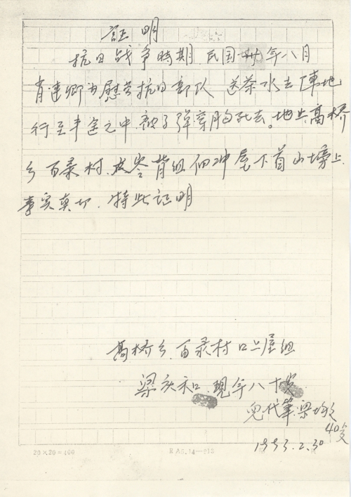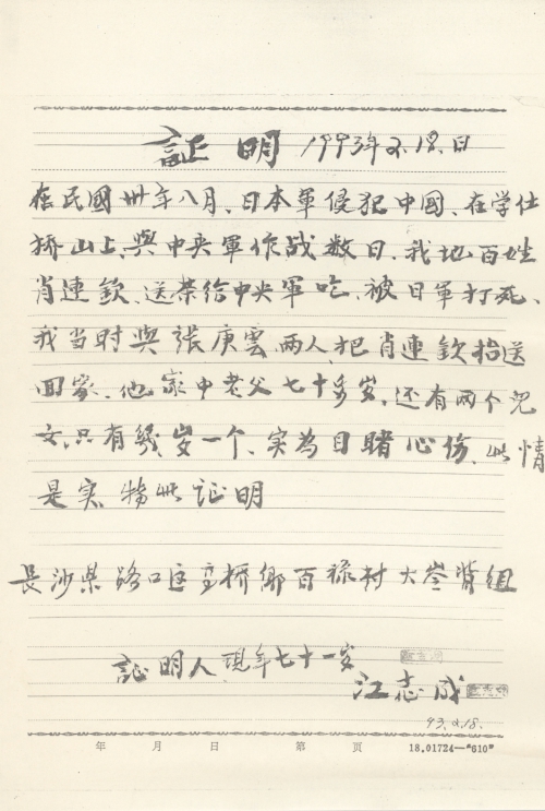 在民国三十年八月,日本军侵犯中国,在学仕桥山上,与中央军作战数日,我地百姓肖连钦,送茶给中央军吃,被日军打死。我当时与张庚云两人把肖连钦抬送回家。他家中老父七十多岁,还有两个儿女,只有几岁一个,实为目睹心伤。此情是实,特此证明