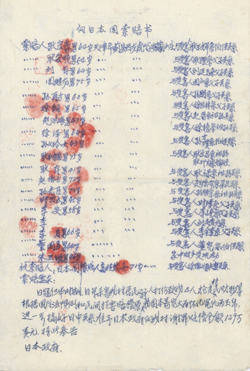 细节:日寇侵华期间杀害我村居民23人打残4人抢走,日寇还毁坏民房抢走财务等等造成百姓损失惨重因此我们受害者后代有权利要求日本政府赔偿我们的所有损失。备注:信封丢失