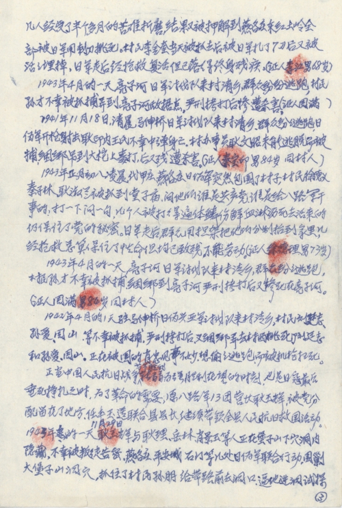1943年4月的一天,亮子河日军讨伐队来村清乡,群众纷纷逃跑,村民孙才不幸被抓捕,捆绑到亮子河严刑拷打后又惨死在亮子河。(证人周满(手印)男 84岁 同村人)