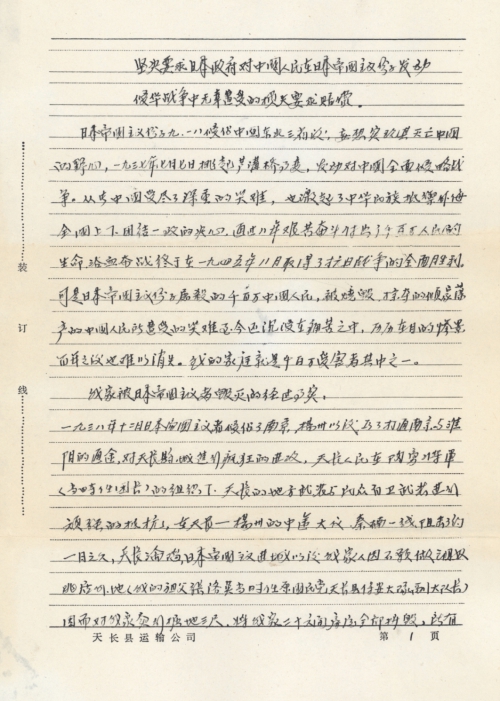 一九三八年十二月日本帝国主义者侵占了南京、扬州以后,为了打通南京与淮阴的通途,对天长县城进行疯狂的进攻,天长人民在陶勇将军(当时任团长)的组织下,天长的地方武装与民众自卫武装进行顽强的抵抗,在天长——扬州的中途大仪、秦楠一线阻击了约一日之久,天长淮阴,日本帝国主义进城以后,我家人因不愿做亡国奴逃居外地(我的祖父张洛莫当时任原国民党天长县保安大队副大队长)因而对我家实行掘地三尺,将我家二十六间房屋全部拆毁,所有细软、家具(附见原房屋平面图及其被劫走的家具设备清单)全部劫走包括古瓷瓶及名人字画,这些古董珍品是无法估价的,强迫民夫百余人劫拿,妄想借此一举慑迫天长人民,以达到日本帝国主义所谓中日亲善,实行大东亚共荣圈而实际是灭亡中国的侵略野心。
