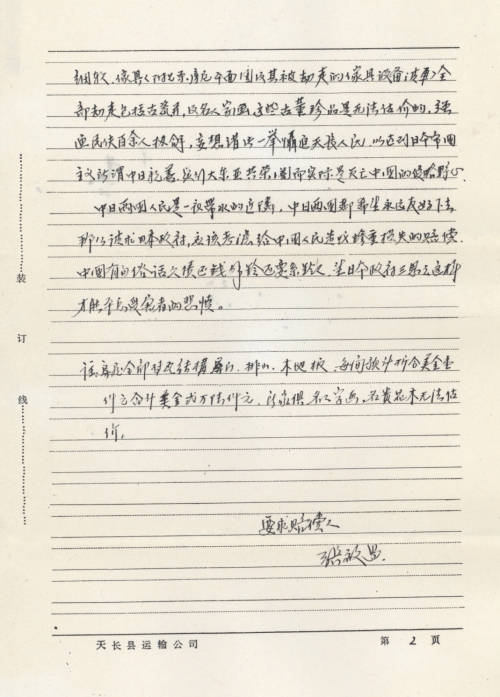 我怀着对您十二万分崇敬的心情,感激您为遭受日本帝国残害的中国人民所作出的义举,我相信所有中华民族炎黄子孙及至受迫害的东亚各国人民都和我一样感激您。在日寇侵华期间,多少人被杀害,多少人家眨眼工夫就变得了家破人亡、倾家荡产,未亲身遭受过日寇残害过的人,他是体会不到当时的惨景,也不会尝受到国仇家恨的心情,一笔账我相信百年之后,也不会忘记,要求日本政府赔偿中国人民遭受日本帝国主义分子残害所受的一切损失。这是天经地义、理所当然。中国有句古训:“杀人偿命,欠债还钱”。就是到解放后,我们是一直遵循的。