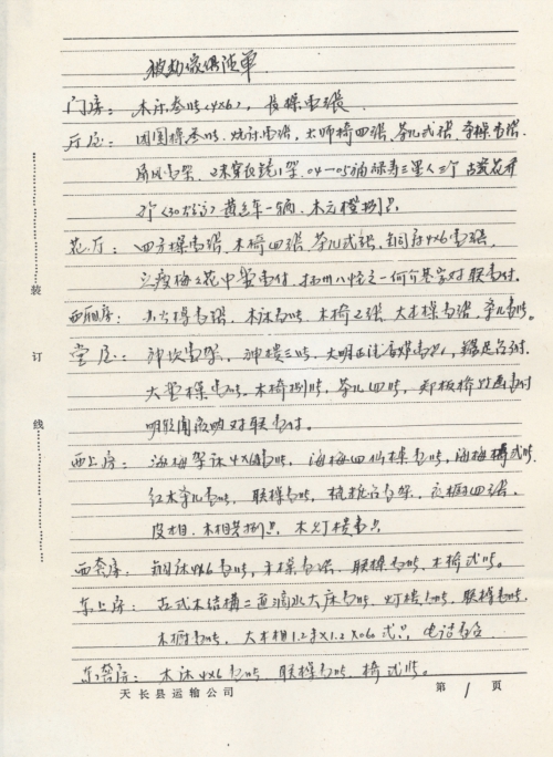 厅屋:团圆桌叁张,焆床壹张,太师椅四张,茶几贰张,条桌壹张,屏风壹架,珠穿衣镜1架,04——05福禄寿三星人三个,古瓷花瓶2个(30公分高)黄包车一辆,木圆凳捌只