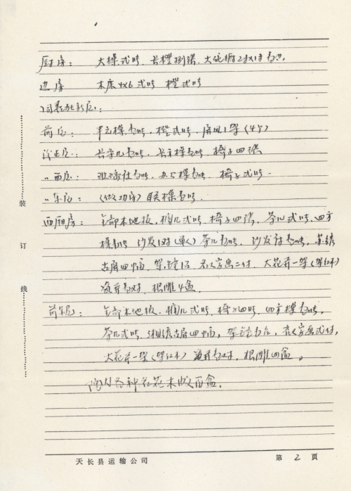 前东屋:全部木地板,搁几贰张,椅子四张,四方桌壹张,茶几贰张,湘绣古屏四幅,架钟壹台,名人字画贰[副],大花瓶一架(架红木),瓷瓶壹对,根雕四盆。
