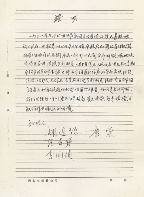 一九三八年冬月二十一日日本帝国主义者侵占我天长县城约二月后,也就是一九三九年三月将本县居民张启昌(其祖父张洛英)住西门北后街房屋一所计二十六间全部拆毁,掘地三尺并将其家具、陈设全部劫走,<其中有乌木、(海梅家具及名人字画)本主另有清单和平面图>又将另外同善社住房的全部家具陈设(包括红木沙发、名人字画、名贵花木)也全部劫走,洗劫一空。日本帝国主义者为中国人民造成的灾难罄竹难书。我们是亲目所睹,我们也强烈呼吁要求日本政府责无旁贷,应予赔偿。方能消除中国人民的义愤。