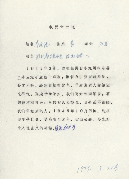 细节:1943年3月我被日军骗到日本在三井三池矿业所挖煤窑做劳工两年多,他们分文不给还经常打骂我们,每天干着累死人的活还吃不饱,有的中国劳工被活活打死,有的被瓦斯烧死。我要在有生之年讨回公道,我要求日本政府给予赔偿。备注:信封丢失