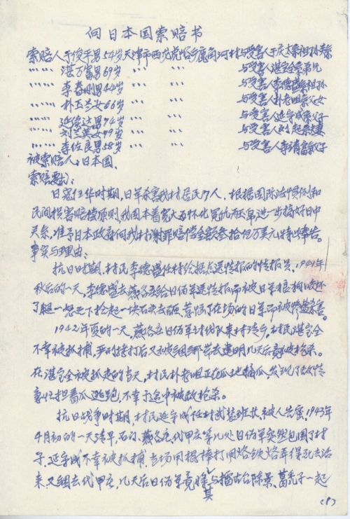 细节:1941年至1943年日军来我我村用暴行折磨村民最终杀害我村民7人,我们是受害者的亲人我们要求日本早日谢罪和赔偿。备注:信封丢失