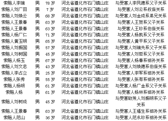 受害人:刘云(刘广田的叔叔)、王贺(王景春的父亲)、杨凯(杨广仁的父亲)等多人