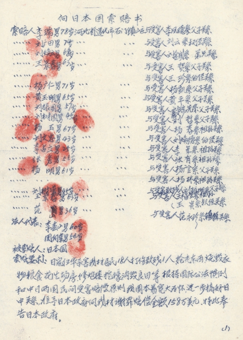 索赔要求:日寇侵华杀害我村居民18人打伤致残1人,抢走东西、烧毁衣物粮食花生、场房、修炮楼挖壕沟毁良田等,根据国际公法惯例和中日两国民间受害赔偿原则,我国本着宽大为怀,进一步搞好日中关系,准予日本政府向我村谢罪赔偿金额158万美元。特此奉告日本政府。