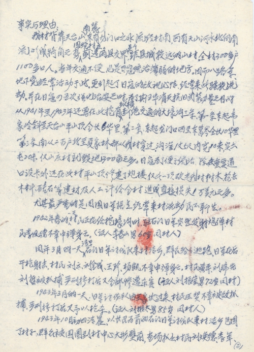 细节:1941年至1943年期间日寇杀害我村民18人打伤致残1人还抢走了百姓的财务烧毁衣物、粮食和房屋等我们要求日本政府赔偿我们受害者所有的损失。备注:信封丢失