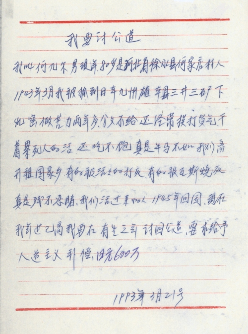 细节:1943年3月我被日军骗到日本在三井三池矿业所挖煤窑做劳工两年多,他们分文不给还经常打骂我们,每天干着累死人的活还吃不饱,有的中国劳工被活活打死,有的被瓦斯烧死。我要在有生之年讨回公道,我要求日本政府给予赔偿。备注:信封丢失