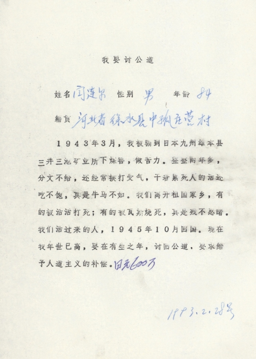 细节:1942年我被押送到达日本后在煤矿当劳工,每天吃不饱还干最重的工作如果偷懒就是挨打几乎每天都有不少劳工死亡我是这一批的幸存者。我要求日本政府赔偿。备注:信封丢失