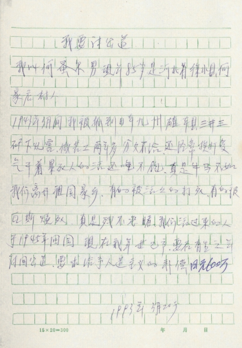 细节:1943年3月我被日军骗到日本在三井三池矿业所挖煤窑做劳工两年多,他们分文不给还经常打骂我们,每天干着累死人的活还吃不饱,有的中国劳工被活活打死,有的被瓦斯烧死。我要在有生之年讨回公道,我要求日本政府给予赔偿。备注:信封丢失