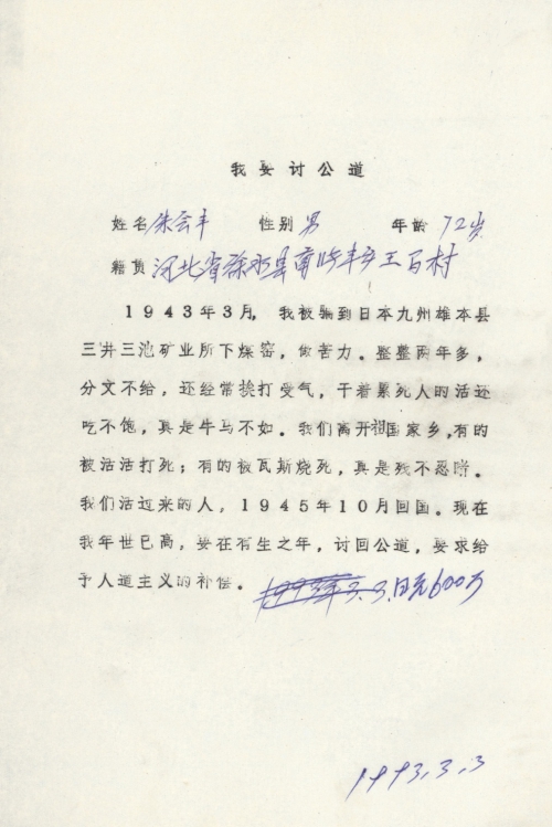 细节:1942年我被押送到达日本后在煤矿当劳工,每天吃不饱还干最重的工作如果偷懒就是挨打几乎每天都有不少劳工死亡我是这一批的幸存者。我要求日本政府赔偿。备注:信封丢失