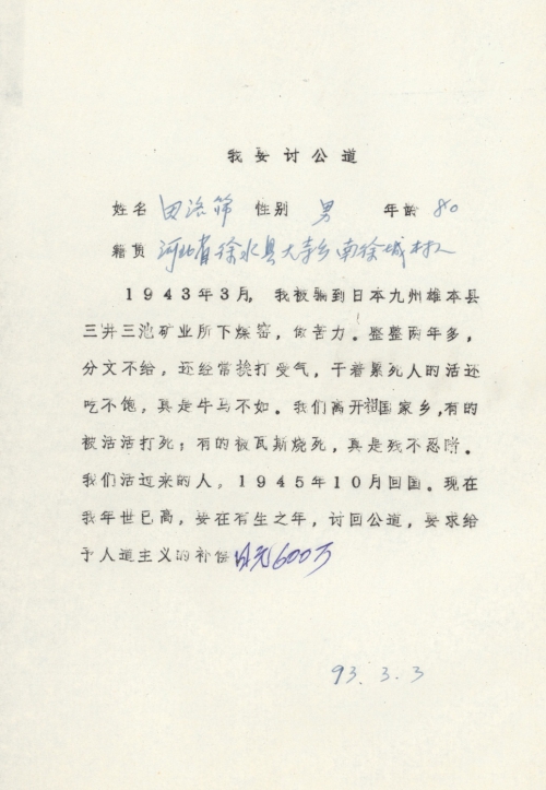 细节:1943年3月我被日军骗到日本在三井三池矿业所挖煤窑做劳工两年多,他们分文不给还经常打骂我们,每天干着累死人的活还吃不饱,有的中国劳工被活活打死,有的被瓦斯烧死。我要在有生之年讨回公道,我要求日本政府给予赔偿。备注:信封丢失