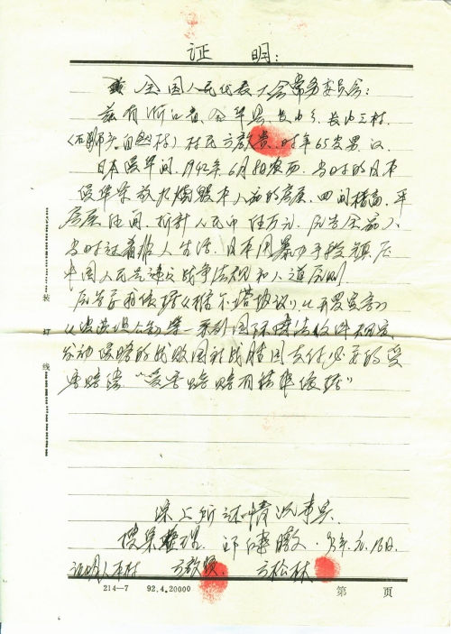 细节:方啟贵家房屋在1942年6月遭到日军烧毁,日本人暴力镇压,要求日本赔偿。