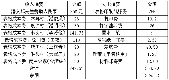六、关于经费问题:此项工作,我们已得到淋川潘文郎先生赞助人民币300元,回收表格成本费449.37元,支付印刷纸张、邮寄差旅费等363.80元,尚余385.5元。将存入淋川信用社,以备今后费用。