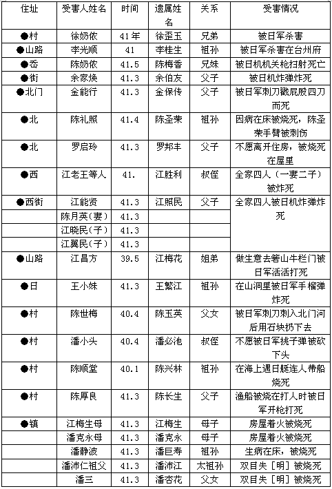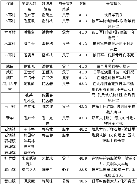 在调查中,我们还摸清了日军此次行动的路线及日军行动的手令。1941年古历3月27日,日军在我木耳山登陆即分[三]路:一路从木耳山经普照寺到松门,第二路从木耳山经山头卒到松门,第三路在石塘粗沙头登陆经上马到松门。在下午四时三路同时到达松门,司令部驻松门陈仲士家。第二天8时由松门来淋川。带有该部司令长官竹下尼风的手令:“松门至淋川及火烧墩一带,阻碍军事,焚烧枪杀。”就这样,肆无忌惮地在淋川烧杀无辜,使整个淋川镇毁于一旦。至下午三时,由淋川经咸田、度爿、新华、苍山折转北沙桥过火烧墩回松门一路焚烧枪杀,惨不忍睹。此手令是日军撤退后在仲士家拾到的,罪证确凿。具体详见统计表(一)表(二)。
