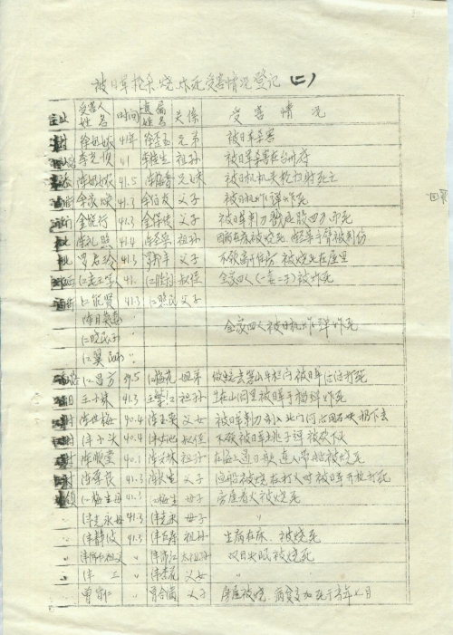 细节:从1992年5月看到“中国对日民间索赔问题”的报告后,我们开始收集调查,调查的重点是1941年3月28日被日军残害的情况,这次被烧民房三千多间,被烧死罗启玲等9人,江能贤等被炸死45人,随信寄来受害者统计表。备注:信封丢失