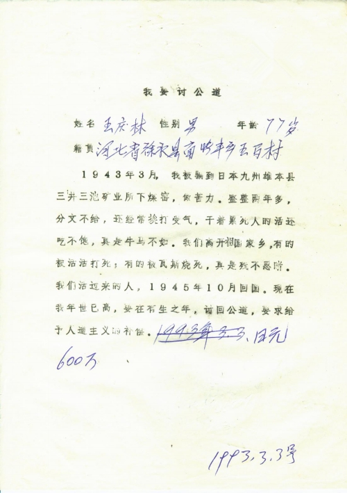 1943年3月,我被骗到日本九州[熊]本县三井三池矿业所下煤窖,做苦力。整整两年多,分文不给,还经常挨打受气,干着累死人的活还吃不饱,真是牛马不如。我们离开祖国家乡,有的被活活打死;有的被瓦斯烧死,真是惨不忍睹。我们活过来的人,1945年10月回国。现在我年[事]已高,要在有生之年,讨回公道,要求给予人道主义的补偿。日元600万。