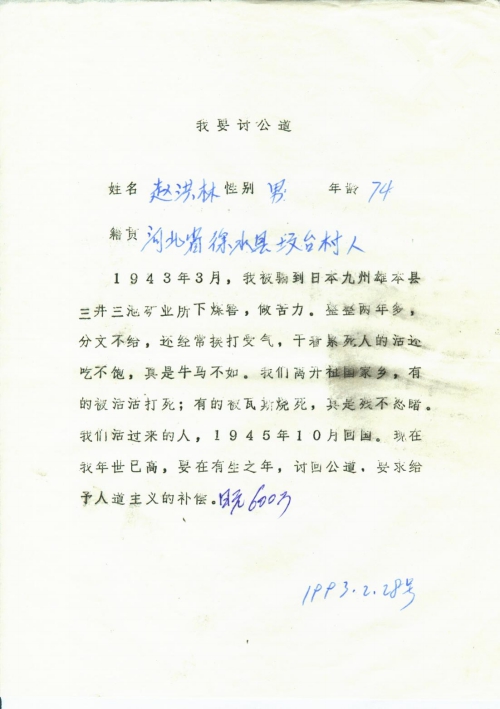细节:1943年3月我被骗到日本雄本县下煤窑,做苦力,两年多,挨打受气,期间有被活活的打死,要求日本赔偿。备注:信封丢失