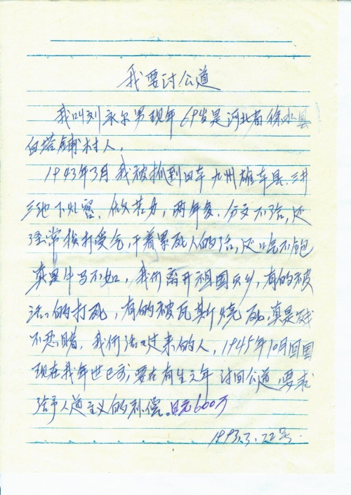 1943年3月,我被抓到日本九州[熊]本县三井三池矿业所下煤窑,做苦力两年多,分文不给,还经常挨打受气,干着累死人的活,还吃不饱,真是牛马不如。我们离开祖国家乡,有的被活活打死;有的被扔瓦斯烧死,真是惨不忍睹。我们活过来的人,1945年10月回国。现在我年[事]已高,要在有生之年讨回公道,要求给予人道主义的赔偿。日元600万。