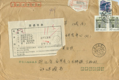 我的详细地址是:浙江省金华县白龙桥镇下杨村,邱健暾,邮号《321025号》。