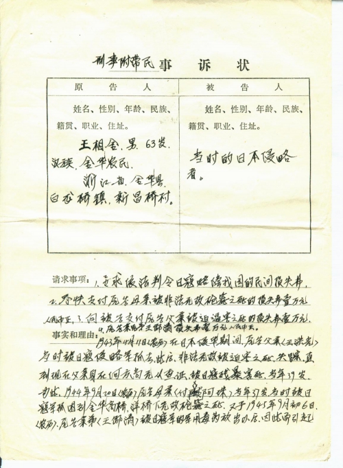 事实和理由:1943年4月11日(农历)在日本侵华期间,原告父亲(王洪光)当时被日寇侵略军抓去,此后,非法无故被迫害之死,失踪,直到现在父亲身在何方尚无从查证,被日寇残暴害死,当年39岁,为此,1944年9月20日(农历)原告母亲(付阿珠),当年37岁,当时被日寇军抓困到金华高桥洋桥下无故枪毙之死,又于1945年9月初6日(农历),原告亲弟(王卸清)被日寇军的军用毒药放出以后,因此而引起中毒死亡,以上三口人全都死在日寇军手上,搁置沉默在心中近半个世纪的沉重话题,我们有了人民的好儿子(童增),所以重新题(“题”编辑为“提”)了出来,这是全中国亿万人民的共鸣和反应,侵略者所犯下的暴行给人类带来的巨大灾难,是任何东西都无法补偿的,逼害了我们中国人民家破人亡,因日本所属军队及个人违反战争法规和人道原则,对我国人民和财产犯下严重罪行所必须由侵略国承担的赔偿,为减少这种损失,必须惩罚无道的战争发起侵略的战败国对各战胜国支付赔偿,中国要求日本“受害赔偿”刻不容缓,受害赔偿是必要的,是合情合理的,是符合国际法的,原告要求依据国际法《雅尔塔协议》及《开罗宣言》和《波茨坦公告》等一系列国际法文件规定向被告支付“受害赔偿”费叁万元人民币正(“正”编辑为“整”),特请国(“国”编辑为“全国”)人大代表和代表负责人为民出力,排扰解难,使能够真正做到人民代表为人民的这一信念,尽力帮助人民的好儿子童增,搞好这次“民间索赔”“受害赔偿”这一重大之事为荷!综上所述情况事实。