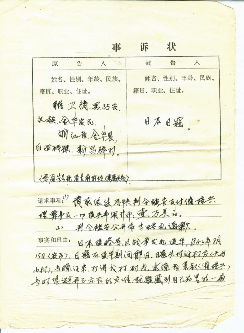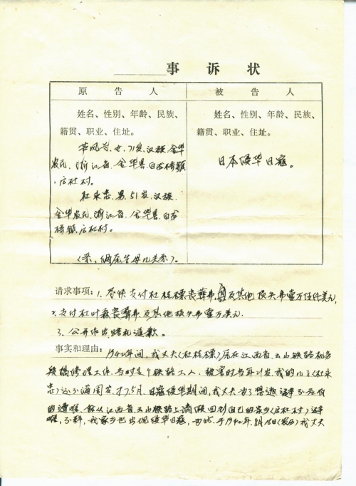 兹有金华县白龙桥镇新昌桥村村民崔培兴,在日寇侵华间于1943年8月15日(农历)晚,确被日本侵华军用刺刀刺了数刀,而活活刺死,当年25岁,该人一贯做人老实,在国向日本国索取“民间损害赔偿”的索赔潮之际,现死者家属之侄,特向全国人大常委会负责同志汇报实情要求索取民间损害赔偿为荷!
