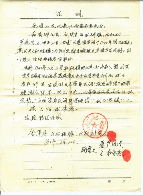 兹有浙江省金华县白龙桥镇后杜村,芦风为,女,现年71岁,为此,日寇侵华间于1942年8月16日(农历),其丈夫(杜桂標)当年21岁,即日确被日本侵华军用刺刀刺了数刀,活活的被当场刺死。