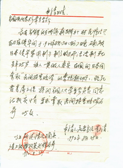在国向日本索取民间“损害赔偿”的索赔潮之际本人特向中央人大代表负责同志汇报实情,“要求索取民间损害赔偿”“刻不容缓”!综上所述事实。