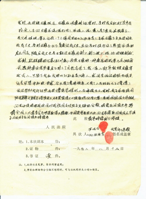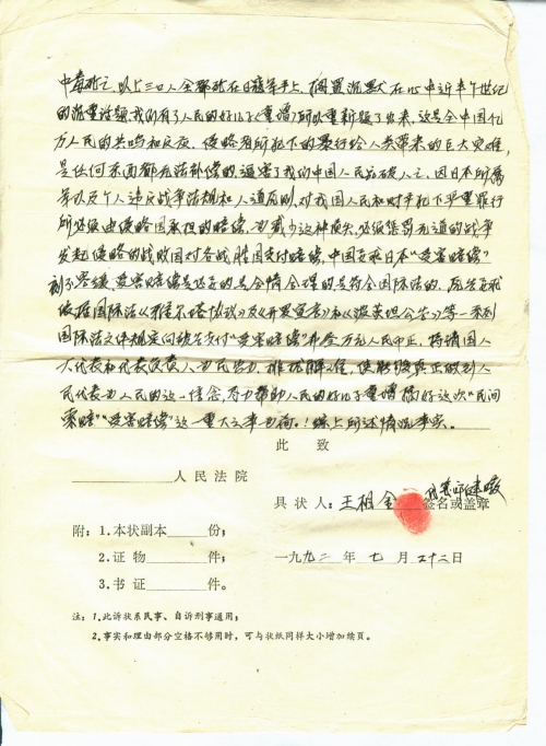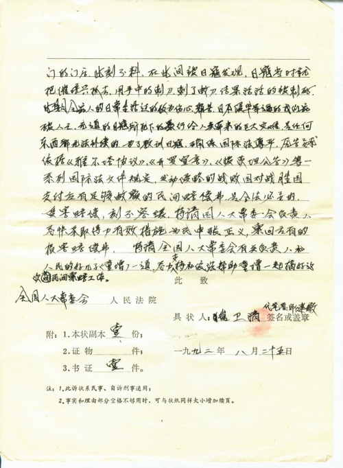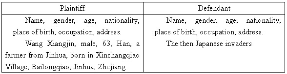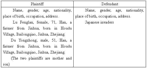Facts and Grounds: On lunar April 11, 1943 during Japan’s aggression against China, the plaintiff’s then 39-year-old father (Wang Hongguang) was captured by the invading Japanese army and later tortured to death. His whereabouts were unknown until today. On lunar September 20, 1944, the plaintiff’s then 37-year-old mother (Fu A-zhu) was arrested by the Japanese army and taken to Yang Bridge, Gaoqiao, Jinhua, under which she was shot dead. On lunar September 6, 1945, the plaintiff’s younger brother (Wang Xieqing) died due to the poison put down by the Japanese army. The above three family members of the plaintiff were all killed by the Japanese army. The heavy topic that has been buried in the people’s mind for half a century is brought up thanks to the people’s good son (Tong Zeng). The terrible disaster the invaders have caused to all Chinese people cannot be compensated by anything. They tore our families apart and made us homeless. In addition, the Japanese army and individual soldiers committed severe crimes to our people and property by violating the laws of war and humanitarian principles. To reduce our losses, the defeated country that launched the war must compensate the winning countries. China demands Japan to make damage compensation without delay, which is necessary, reasonable and in line with the international laws. The plaintiff demands the defendant to make damage compensation of RMB 30,000 in accordance with international laws such as Yalta Agreement, Cairo Declaration and Potsdam Declaration. I sincerely ask the NPC members to remove troubles for the people by upholding the philosophy of representing the people and by helping the people’s good son Tong Zeng with the great cause of “civil claims” and “damage compensation”. The above facts are true.