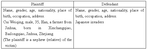 Facts and Grounds: One night during Japan’s aggression against China, the Japanese army entered our village from our neighboring village Tianmushan. My uncle (Cui Peixing) hid behind a door in his house to avoid suffering, but was found by a Japanese soldier. The solider arrested him and bayoneted him to death, which caused great pain to my whole family and tore us apart. The terrible disaster the Japanese army has caused to humans cannot be compensated by anything. To teach the Japanese army a lesson and defend the dignity of international laws, the plaintiff demands the defeated country that launched the war to make adequate civil compensation to the winning countries in accordance with international laws such as Yalta Agreement, Cairo Declaration and Potsdam Declaration. Civil compensation is necessary, legal and just. I sincerely ask the NPCSC to take effective measures to pursue justice for the people and help the people’s good son (Tong Zeng) with the claim for damage compensation against Japan.