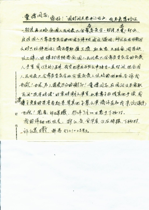 I’ll come straight with you due to limited time. I intended to write a letter to you and the National People’s Congress Standing Committee (NPCSC) respectively. But my letter sent to the NPCSC was returned because the address was not clearly stated. That leaves me no choice but to turn to you for help. Please forward 4 letters from Cui Weiqing, Du Yongzhong, Wang Xiangjin and Zhou Changmei to the office (or residence) of the head of the NPCSC. Besides, maybe you can spare a moment to tell me the residence address of the head of the NPCSC? I am deeply grateful for that. Comrade Tong Zeng, please correspond with me if other procedures are required to be handled or more victims are needed in the claim for damage compensation against Japan.