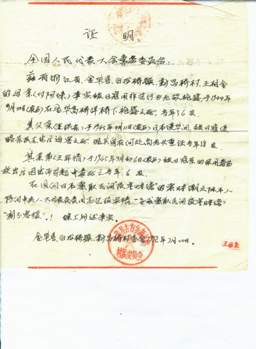 This is to certify that the mother (Fu Azhu) of Wang Xiangjin, born in Xinchangqiao Village, Bailongqiao, Jinhua, Zhejiang, was illegally shot dead by the Japanese army under Yang Bridge, Gaoqiao, Jinhua on lunar September 20, 1944. She was then 36.