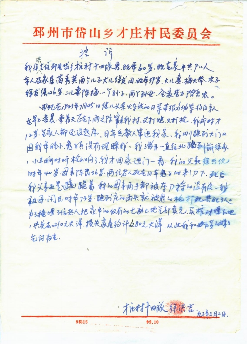 细节:1945年7月25日,日军入侵我村父亲徐兴信、母亲陈氏、祖母3人被杀害,自此我和九岁的妹妹乞讨为生。备注:信封丢失