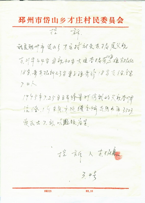 21 10 月, 2018 s3404 Share EmailTwitterFacebookGoogle +PinterestTumblrLinkedinVkontakte 信扫描序列号:s3404 写信日期:日期不详 写信地址:江苏省徐州市邳州市(县级市) 受害日期:1945-07-25 受害地址:江苏省徐州市邳州市(县级市) 写信人:李振泉 受害人:李巧早(李振泉的父亲) 类别:谋杀(MU) 细节:我父亲李巧早在1945年7月25日被日军杀害,自此我们讨饭为生。备注:信封丢失 控诉 我是邳州市岱山乡才庄村社员李振泉,父亲李巧早44岁,母亲40岁,大姐李根芬20岁,二姐李根红18岁,哥李根新23岁,妻子孙秀珍18岁,共计全家7口人。 1945年7月25日日本惨案打伤我的父亲李巧早,治疗1年8月,才拖经痊愈,花费费用350元,卖出去7间,以讨饭为生。 控诉人李根泉(手印) 3月4号 21 10 月, 2018 10000cfj_3o5som 谋杀(MU)