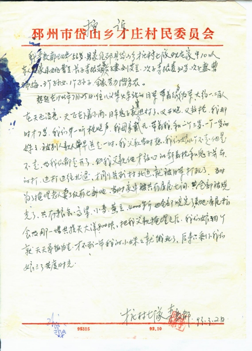 想起在1945年7月25日,住八义华火车站的日军带着很多伪军,大约一、二百人在天还没亮,天正在下着小雨,日本鬼子就窜进村子,又开炮,又放枪。我那时才7岁,我们一听枪炮声,我母亲戴氏带着我和一个三岁,一个一岁的妹妹,被别人亲人早早送走一时。我父亲当时想,我们娘儿个不走,他是不走,等我们都走开了,我父亲他才放心的拿着枪和鬼子[拼]命的打。边打边往北退,才刚[拼]到村北边,就被日军打死了。当时为了掩埋老人,卖了仅有七亩地,当时家中共有房屋七间,全部被烧光了。共有粮食、高粱、小麦、黄豆4000余斤,也全部烧光了,卖地、房屋、粮食等,那一场共损失大洋800块,把我父亲掩埋之后,我们娘四个就天天要饭为生,才不到一年我的小妹妹就饿死了,后来只剩下我们娘三人苦度时光。