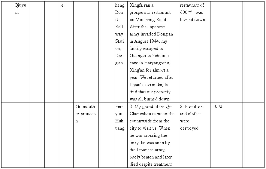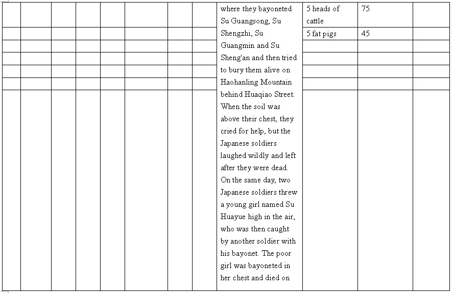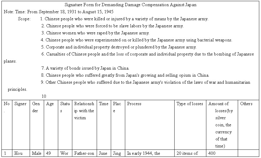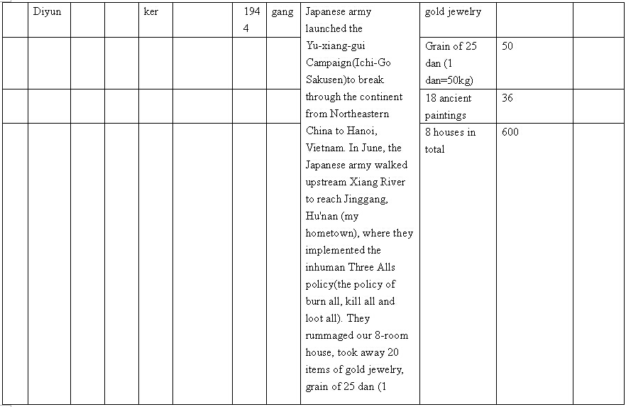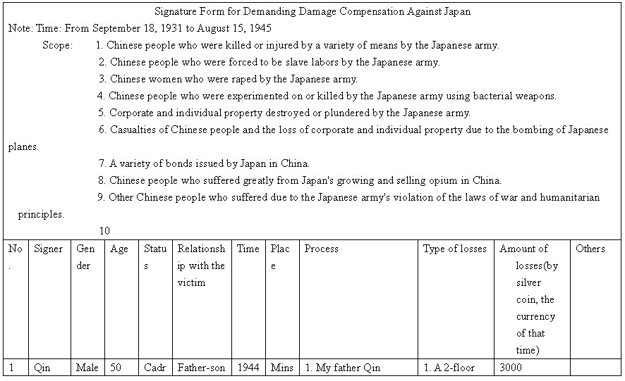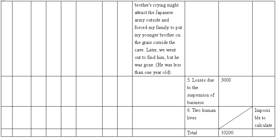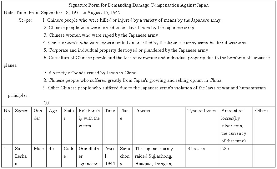 Other details:On July 20, 1944 on the lunar calendar, Japanese invaders splashed kerosene on houses and set fire, which burned hundreds of houses. Over 1000 people became homeless, they also uses living people as target and killed them, raped women and committed other towering crimes. Now I mail you the compensation signature form and brief description of persecution, and we demand the Japanese government must compensate all victims’ losses and apologize to victims.